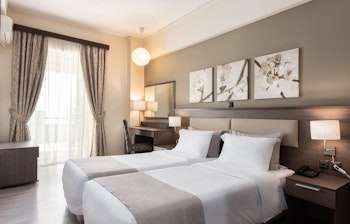 Dette hotel ligger i hjertet af Athen i gåafstand fra Akropolis-klippen, spændende museer og det charmerende Plaka-kvarter, der med sine hyggelige gader og restauranter altid er besøget værd. Nær ved finder du flere andre kendte pladser, templer og kvarterer med gode shoppingmuligheder, som det imødekommende personale i den døgnåbne reception gerne peger dig henimod, og hvis du vil videre ud i byen, ligger både bus- og metrolinjer også ganske belejligt bare 50 meter væk.